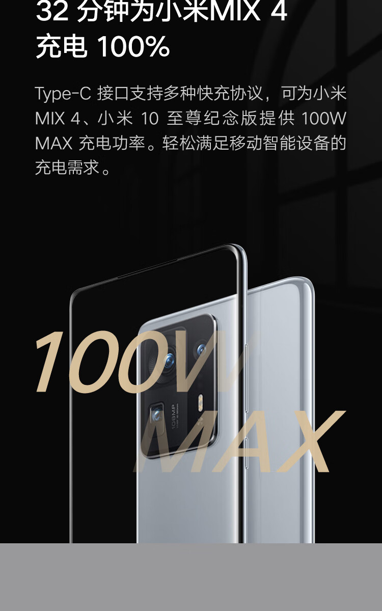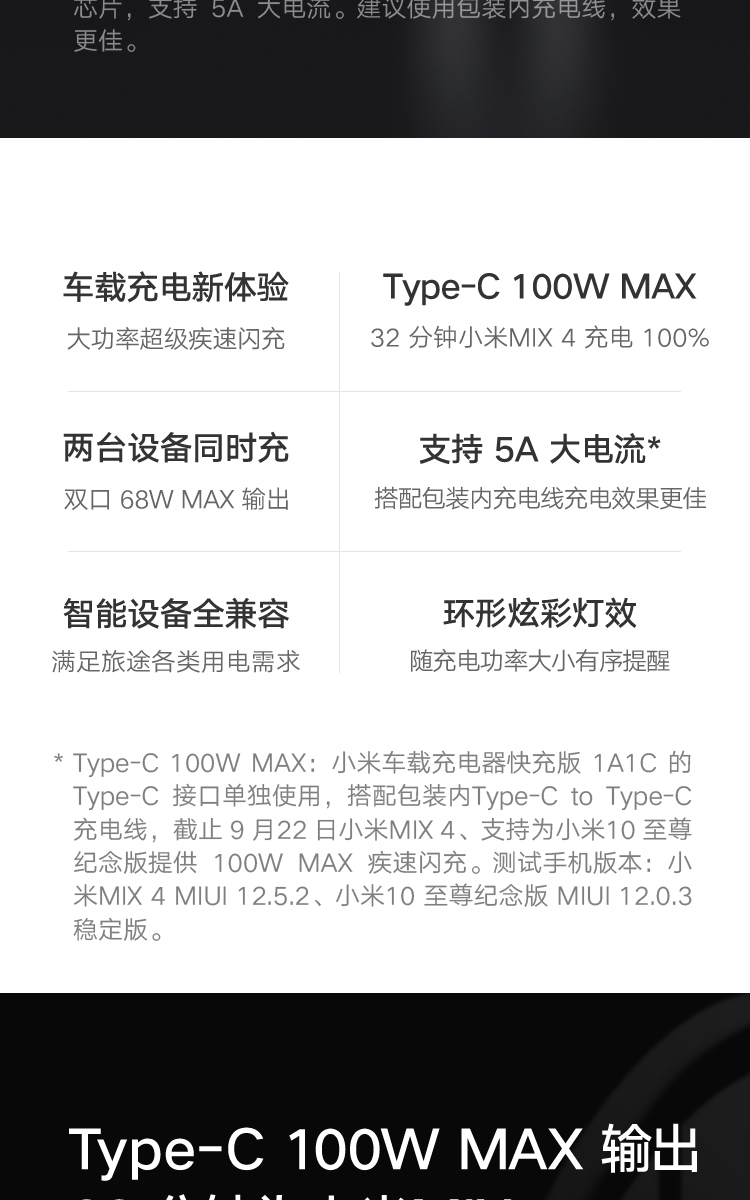 商品名称:小米(MI)车载充电器快充版1A1C 100W大功率多功能汽车专用智能车充适用于小米手机/小米YU7汽车